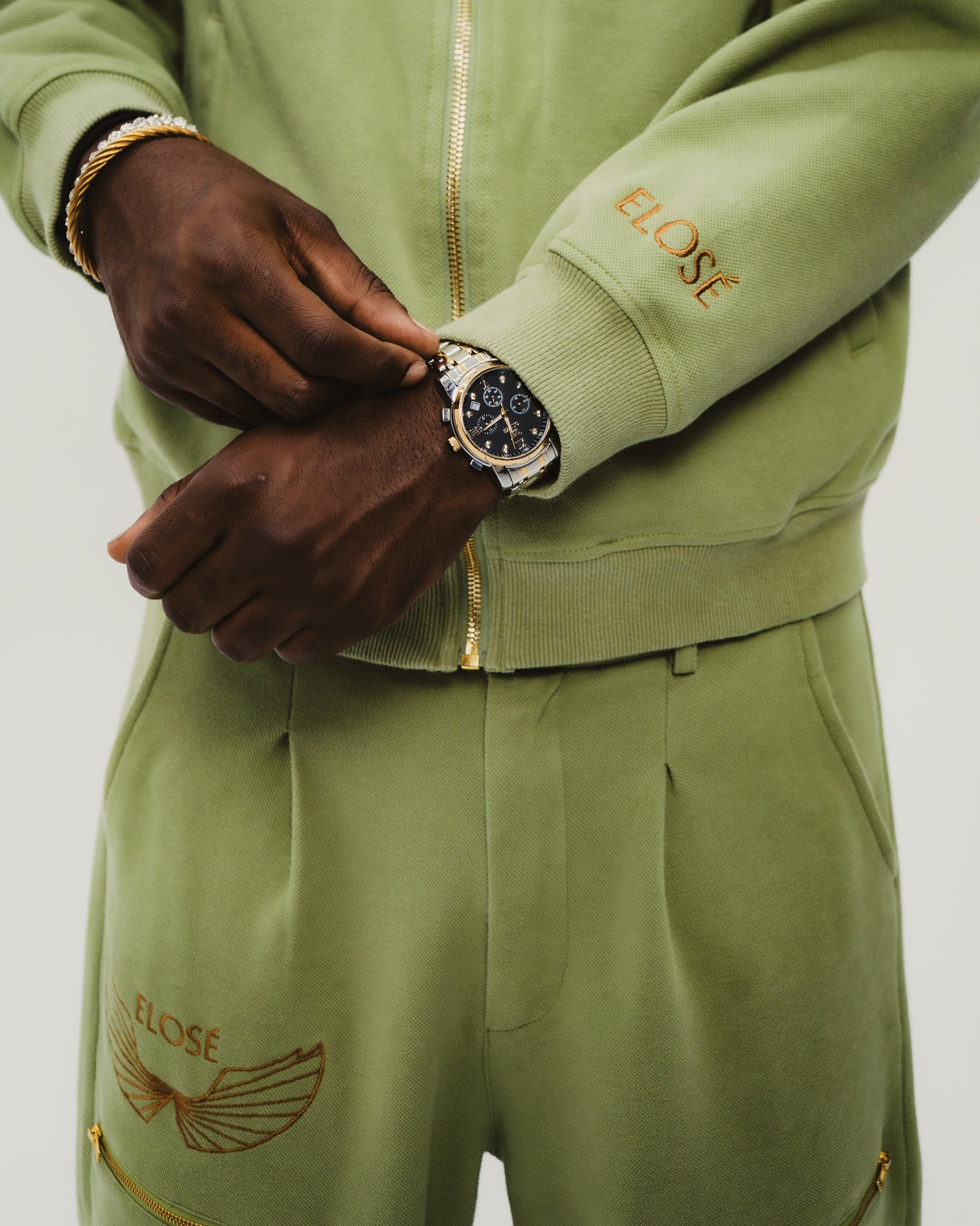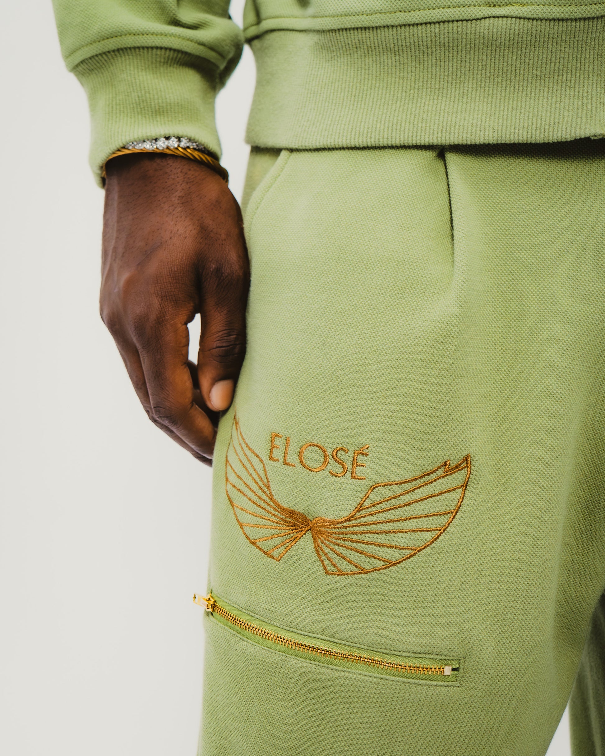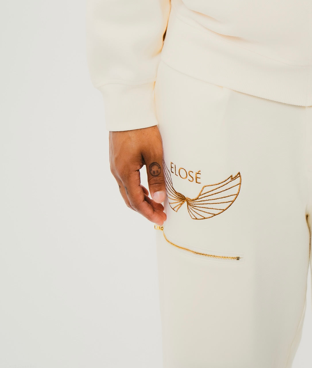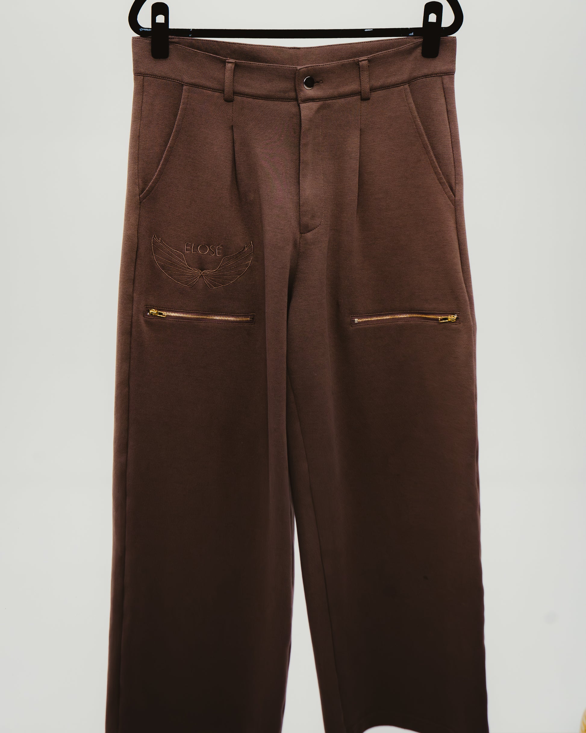 These sweatpants are made from medium weight cotton pique with gold accents and brown embroidery throughout perfect for the fall. It is cut in a comfortable straight shape with a short pleat for added detail. These pants are decorated with 2 additional front pockets and a hidden back pocket with a seamless magnetic snap.
